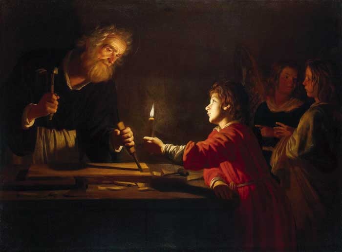 Warsztat stolarski św. Józefa pogrążony jest w ciemności. Mały Jezus trzyma więc świecę, by Józefowi łatwiej się pracowało. Świeca oświetla bardzo dobrze twarz Zbawiciela, który z podziwem i miłością wpatruje się w swego opiekuna.