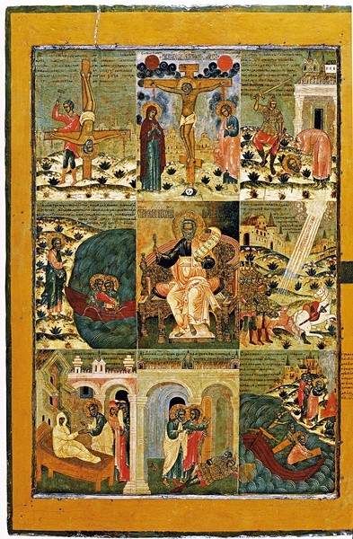 Głównym tematem tej rosyjskiej ikony, podzielonej na dziewięć scen, jest osoba świętego Piotra – postać najważniejszego z apostołów zajmuje środkową część kompozycji. Widzimy tam Piotra zasiadającego na papieskim tronie, dzierżącego zwój Pisma Świętego i klucz do królestwa niebieskiego, który wręczył mu Jezus jako znak władzy w Kościele.